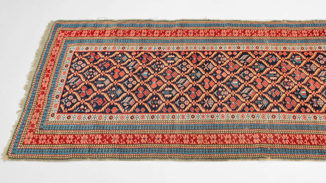 An exceptional example of the Seychour tradition, this runner stands out for the clarity of its drawing, crisp geometry, and refined palette. A tightly organized lattice of abstracted floral forms runs the full length of the field, each element articulated with precision and rhythm that feels both deliberate and energetic.