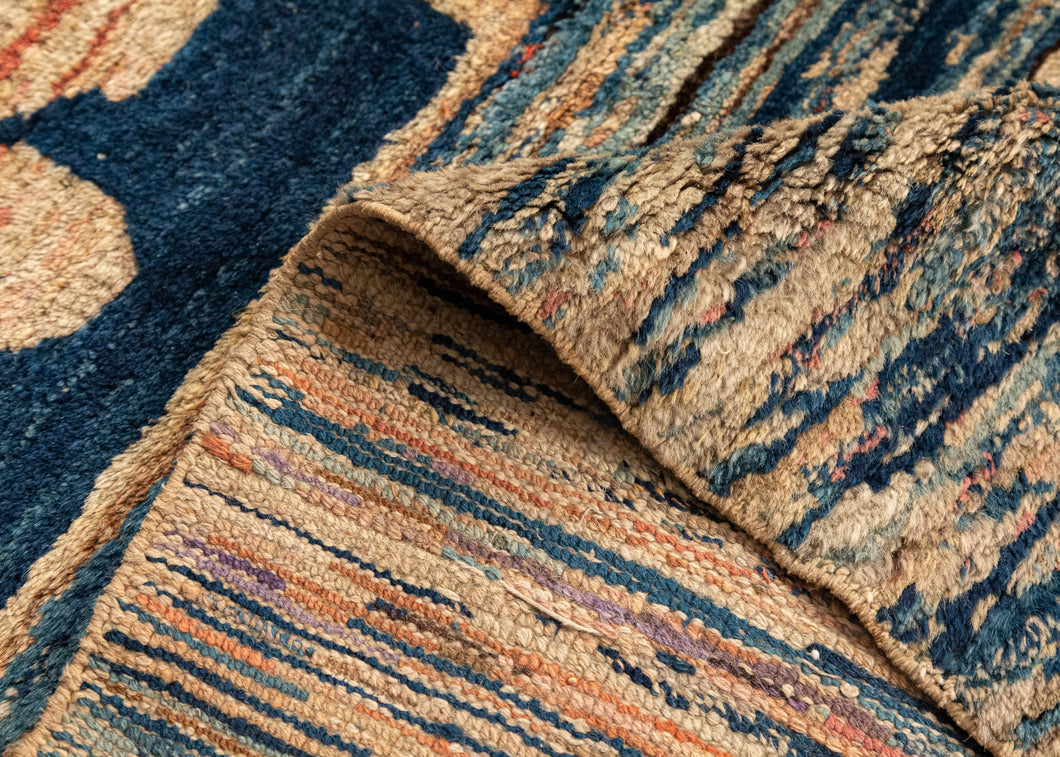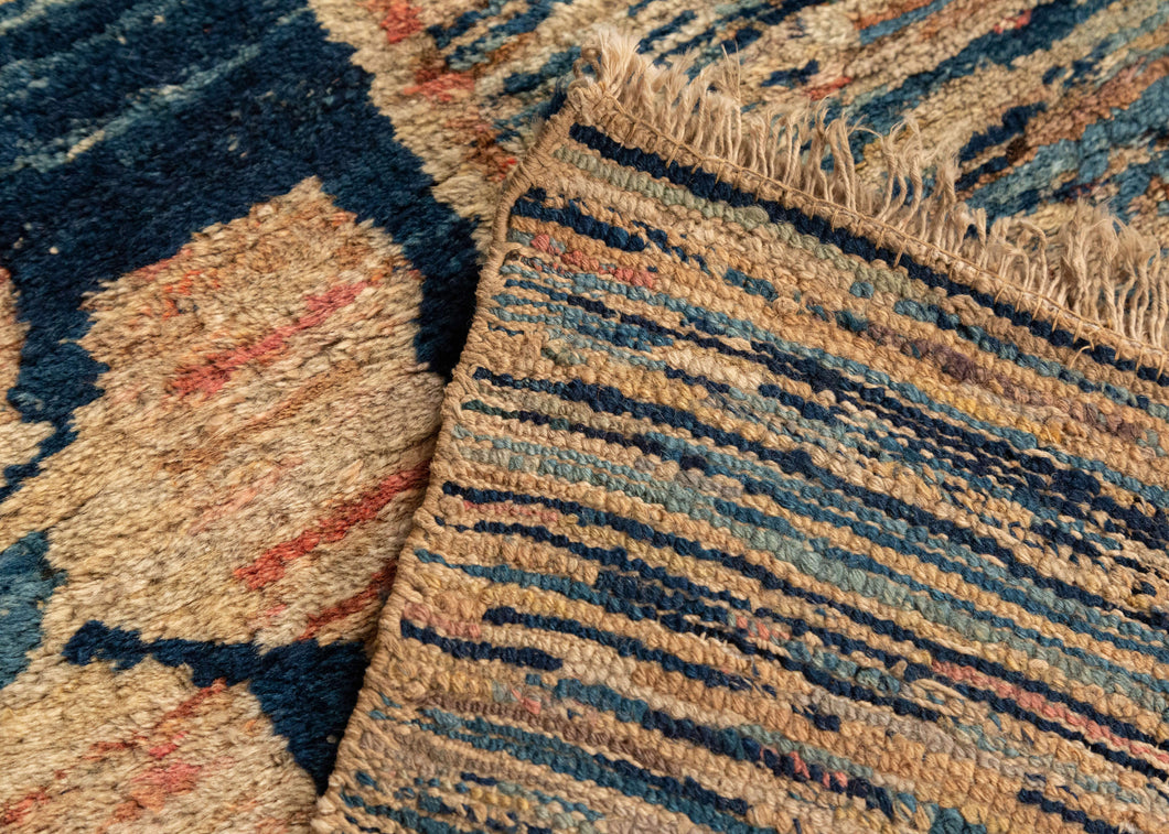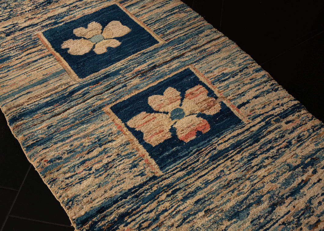 This rug features a minimalist design of two central flowers in deep blue squares, on a striated field of pinks, blues, and beiges, highlighting the beauty of the colors and the minimalism of the design. There is a small sacred seed symbol for "Ah" near the corner. Ah is an important mantra used in meditation.