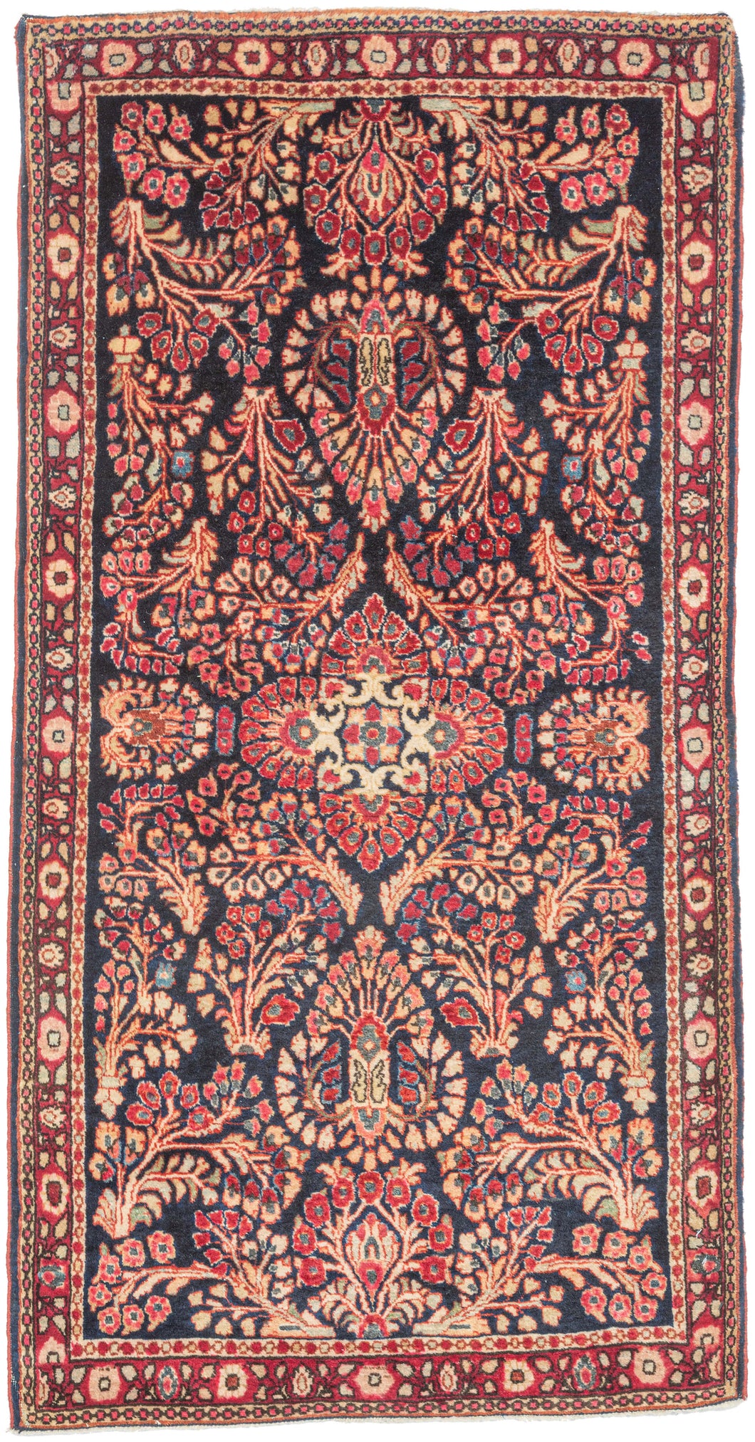 This finely woven Sarouk exemplifies the lush floral language that made the region’s carpets among the most sought-after of 1920s. Set against a deep midnight-blue ground, an intricate lattice of scrolling vines, palmettes, and rosettes unfolds with remarkable density and clarity, anchored by a subtle central medallion that gives structure to the otherwise allover composition.