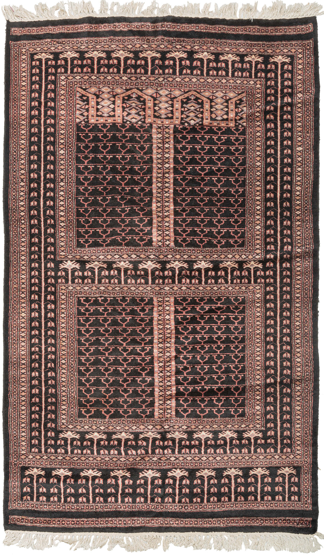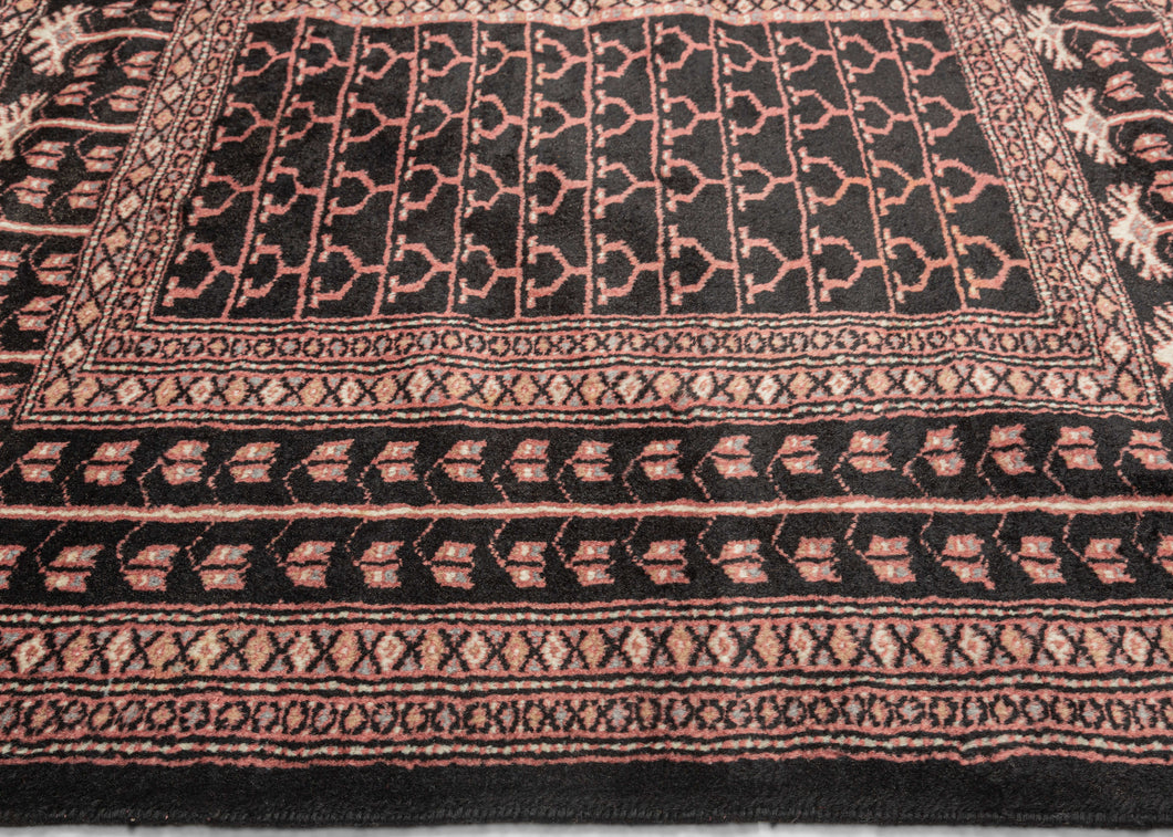 This Bokhara was woven in Pakistan during the 1980s.  With an uncommon design for Bokhara rugs it for Bokhara features a classic Ensi design and a lovely skirt border on one end all on a desirable and uncommon black ground. Ensi rugs were woven by Turkmen tribes and traditionally used as a door cover or entrance to a yurt. Their is a belief among seasoned Turkmen collectors that the intention of this pattern was to represent a door or window to the afterlife.