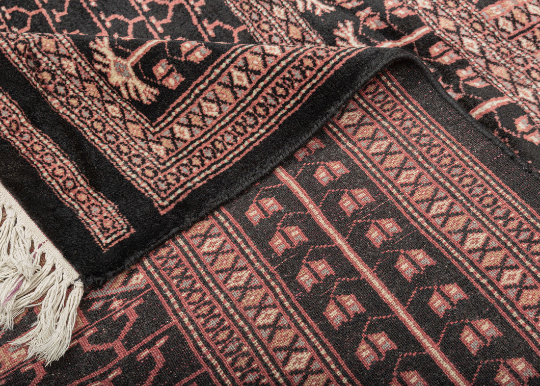 With an uncommon design for Bokhara rugs it features a classic Ensi design and a lovely skirt border on one end all on a desirable and uncommon black ground. Ensi rugs were woven by Turkmen tribes and traditionally used as a door cover or entrance to a yurt. Their is a belief among seasoned Turkmen collectors that the intention of this pattern was to represent a door or window to the afterlife.