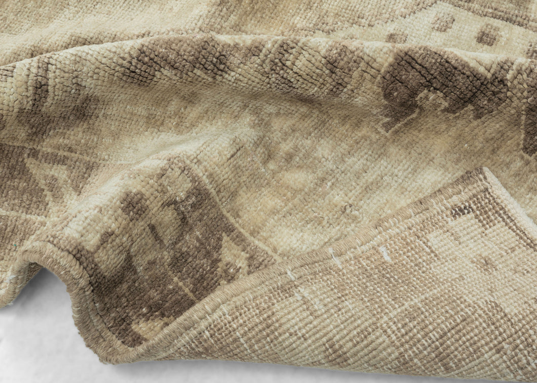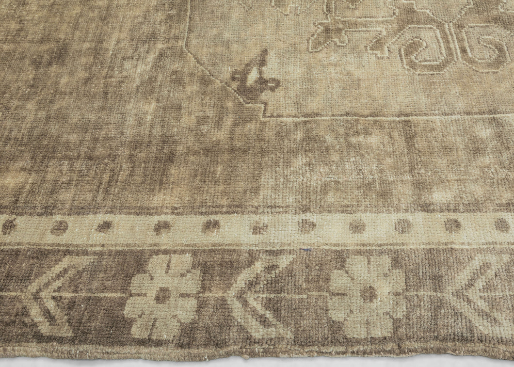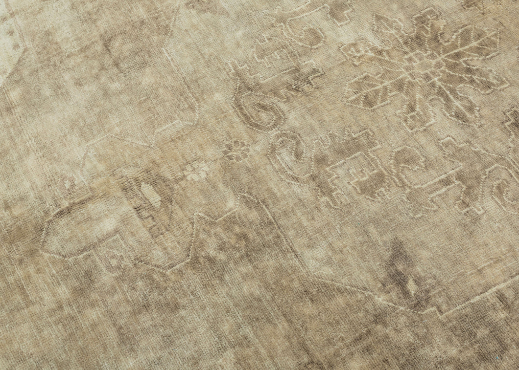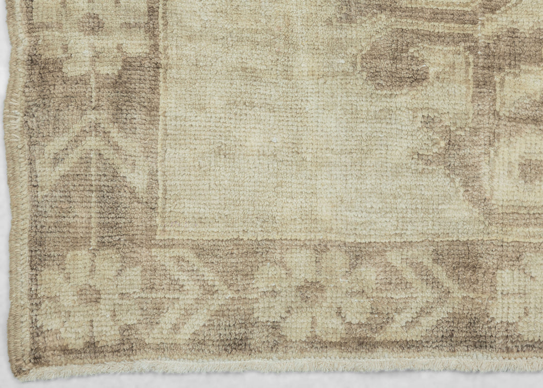 It features a central medallion on an open field with four cornices. The ornate patterning is softened by the limited palette of beiges and browns. Soft tones and limited contrast make this a very easy rug to decorate around.