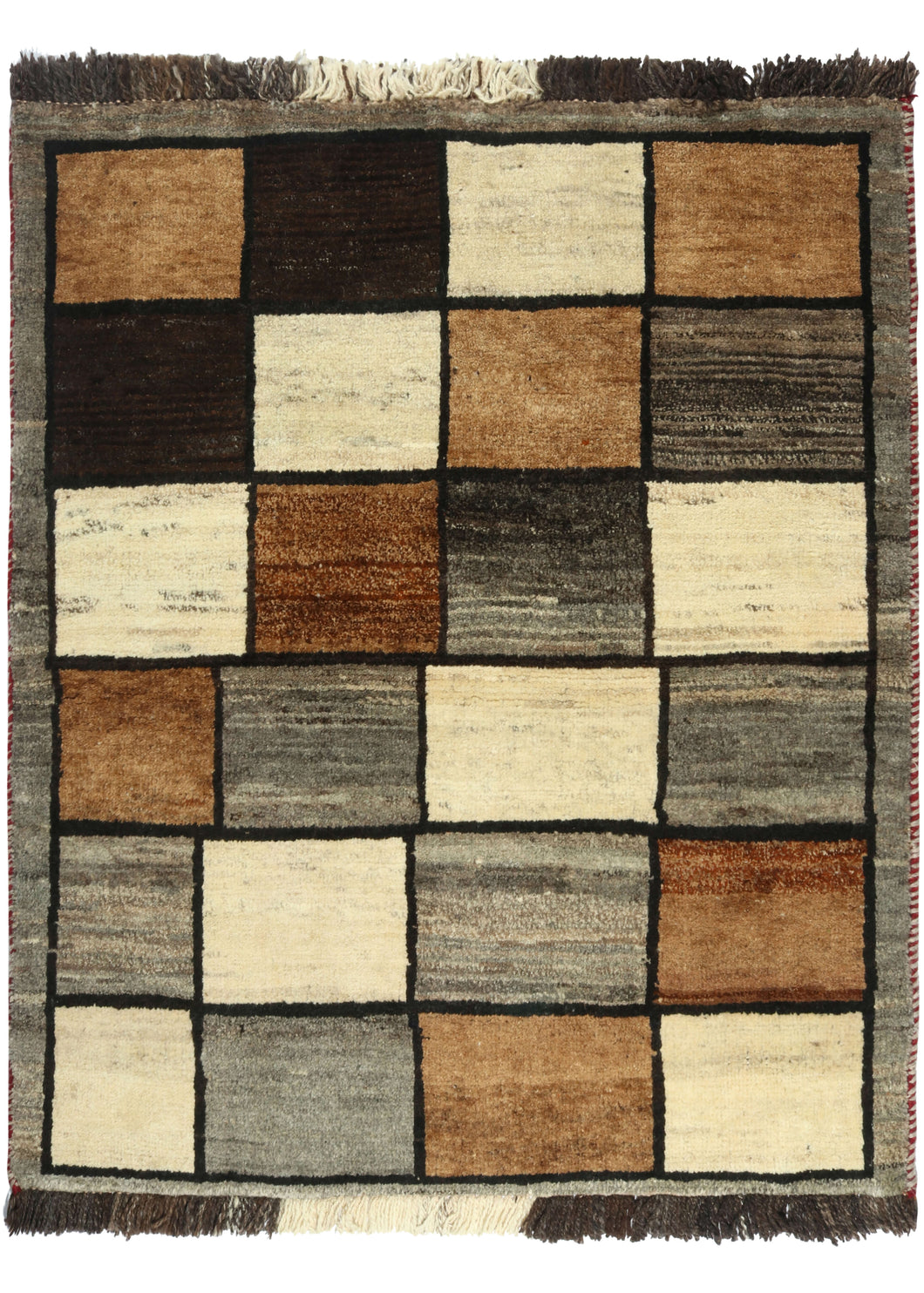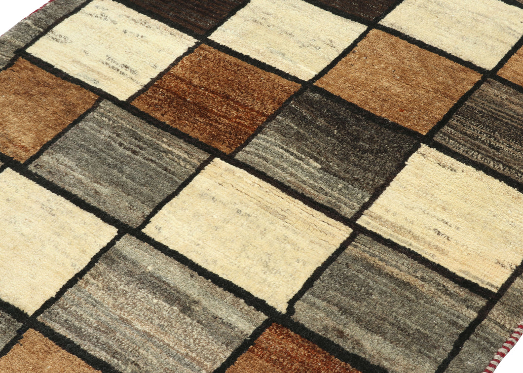This Vintage Checker Gabbeh Rug  features a field of checkered squares composed of a variety of variegated tones of undyed wool in shades of gray, beige, and dark and light brown. The squares are neatly yet imperfectly ordered slightly shifting in scale. Each square is clearly delineated in a dark brown outline and the whole composition is framed by a gray band. Both light and dark handspun wool warps were used which add visual interest to the fringes. The pile is densely woven, making this a plush rug.