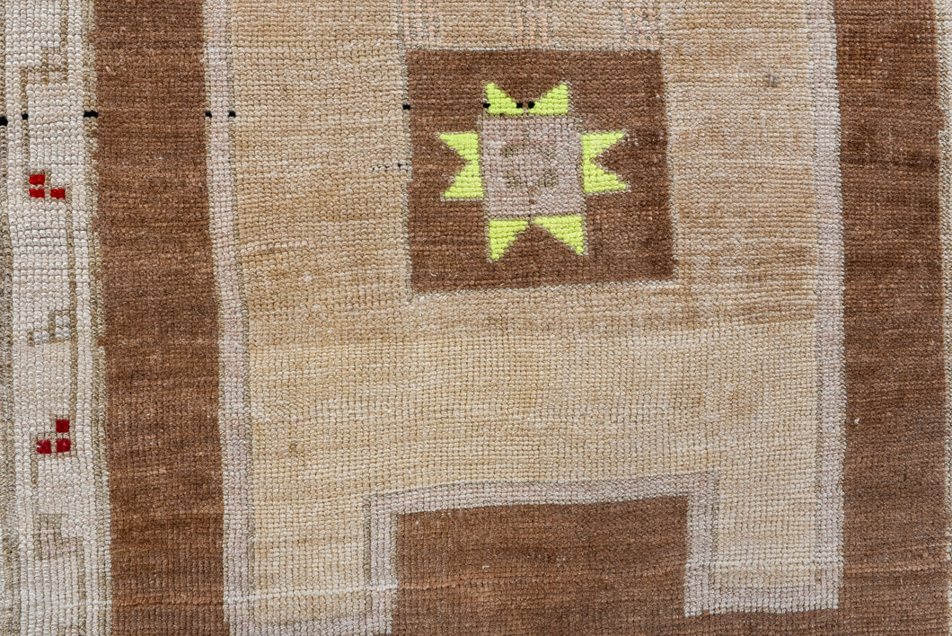 It features a directional camel ground mihrab atop an open chocolate ground. The center of the mihrab features a square in the same chocolate ground filled with an eight pointed star. The star sparkles in a very prominent highlighter yellow. Framed by a simple scrolling cream border with groupings of small red berries and a couple pops of yellow. KARS