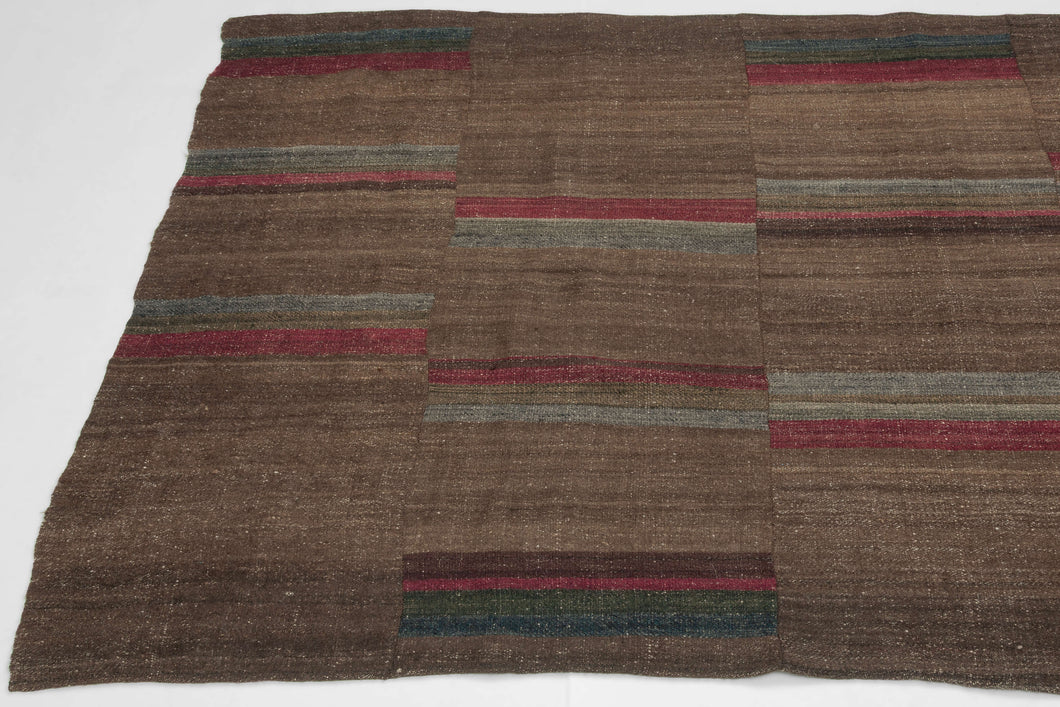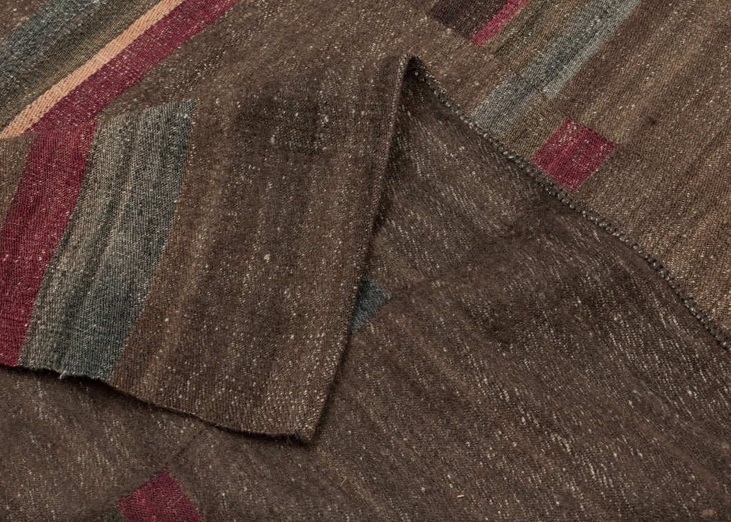 The palette is grounded and earthy with warm browns enlivened by muted bands of madder red, indigo, slate blue, and soft celadon. The wool is dense yet pliable, with visible flecking that speaks to local sheep breeds and traditional spinning methods. Gentle abrash and uneven striping lend the textile a lived-in warmth rather than strict symmetry.