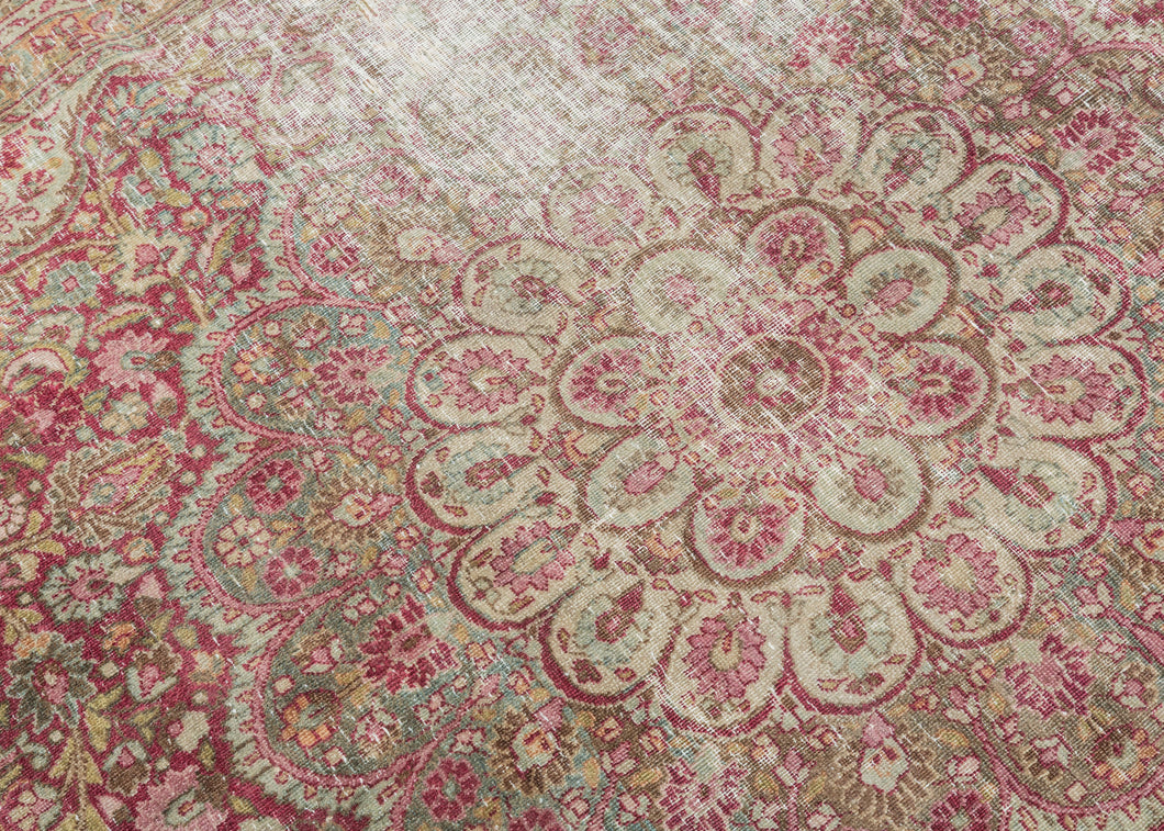A beautifully timeworn example from the famed workshops of Meshed, this decorative rug exudes character and quiet elegance. The design centers on a soft rosette medallion surrounded by an intricate field of scrolling floral vines and palmettes in tones of rose, ivory, pistachio, and faded turquoise. The allover pattern radiates a sense of harmony and refinement, the hallmarks of Meshed weaving during its classical period.