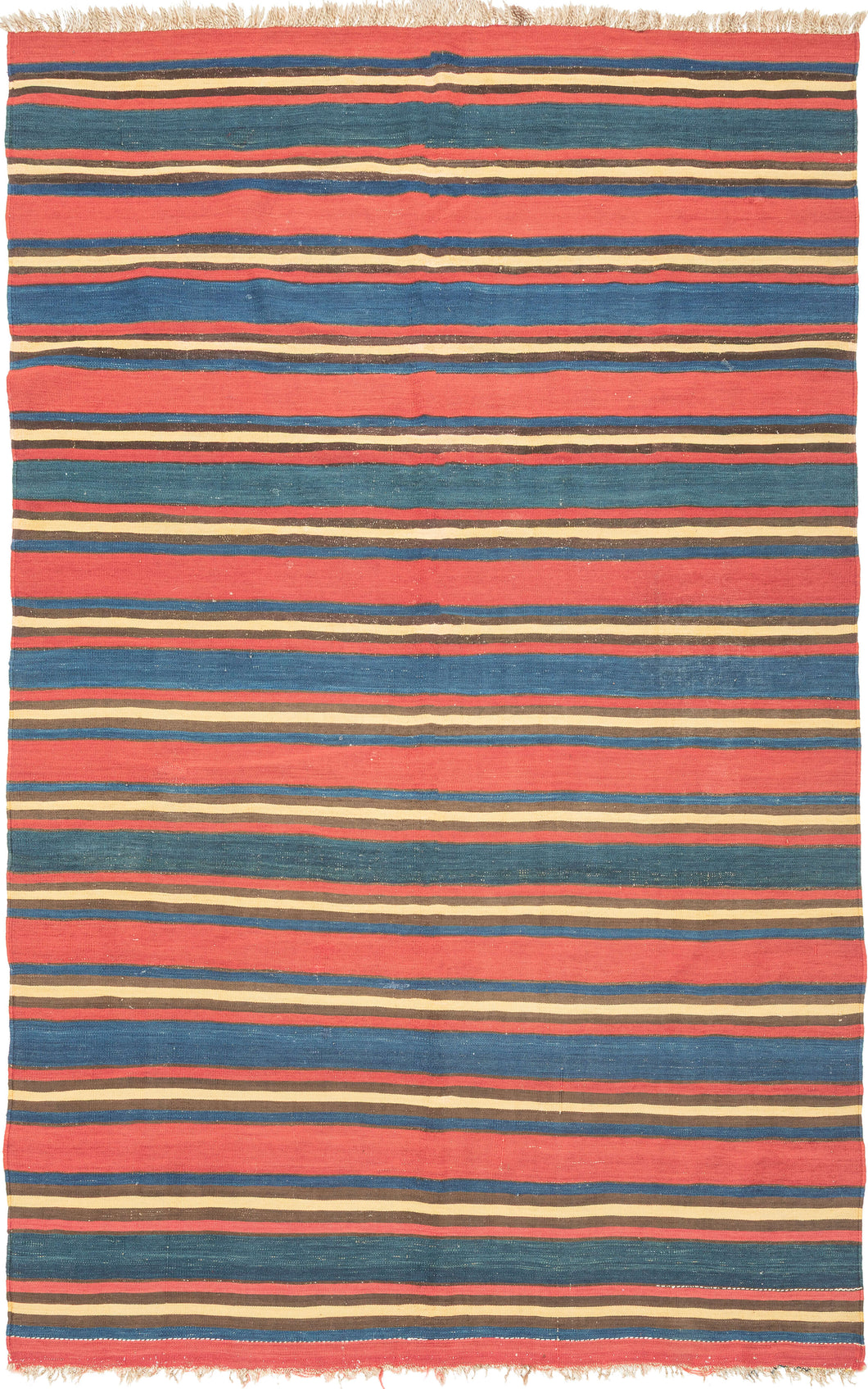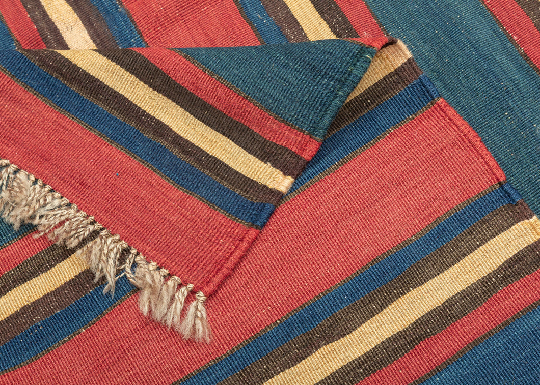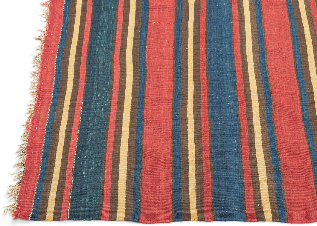 A striking example of simplicity elevated to art, this antique Shahsavan kilim reveals the timeless sophistication of stripe-based design. Its alternating bands of madder red, indigo blue, golden ochre, and earthy brown create a bold yet harmonious rhythm across the surface. The restrained palette and unbroken horizontality give the piece a modernist clarity that feels as relevant today as it did over a century ago.