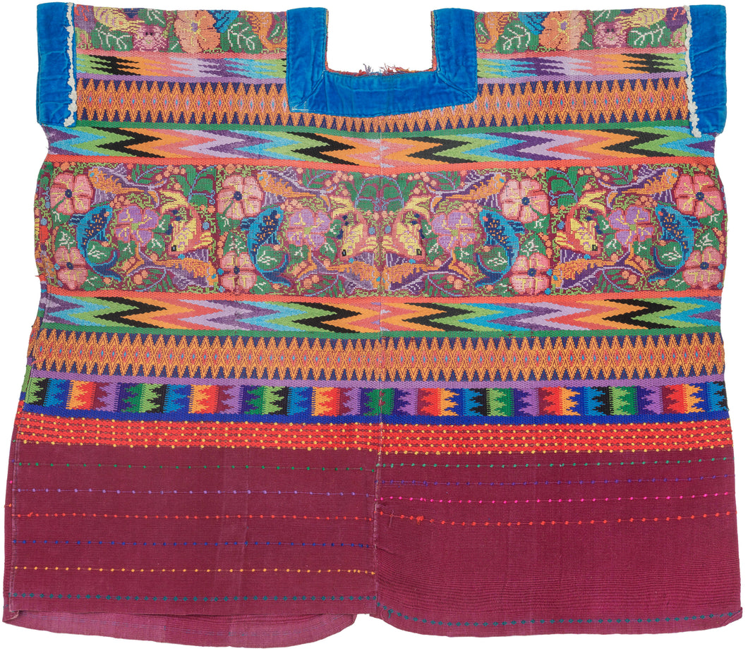 This spectacular Huipil is alive with symbolism and saturated color. The brocaded upper panel features a lush tableau of birds, flowers, and brilliantly woven fish, each motif carrying deep resonance in Maya tradition. Birds evoke freedom and the sky, flowers embody fertility and beauty, and fish symbolize life’s connection to water and abundance.