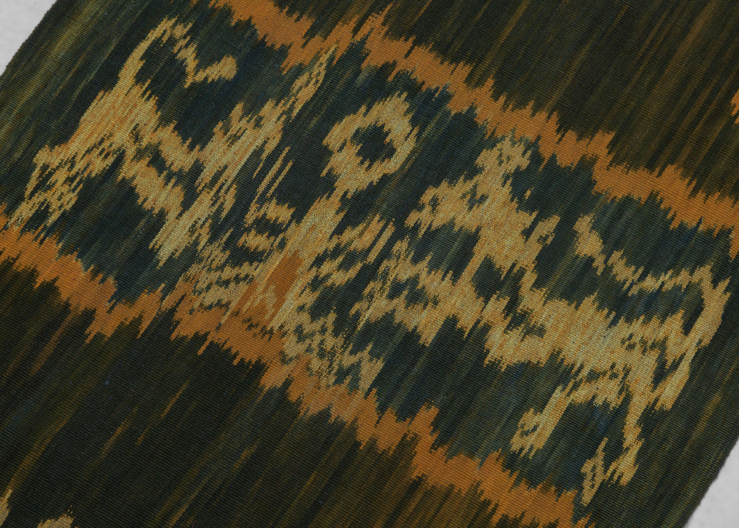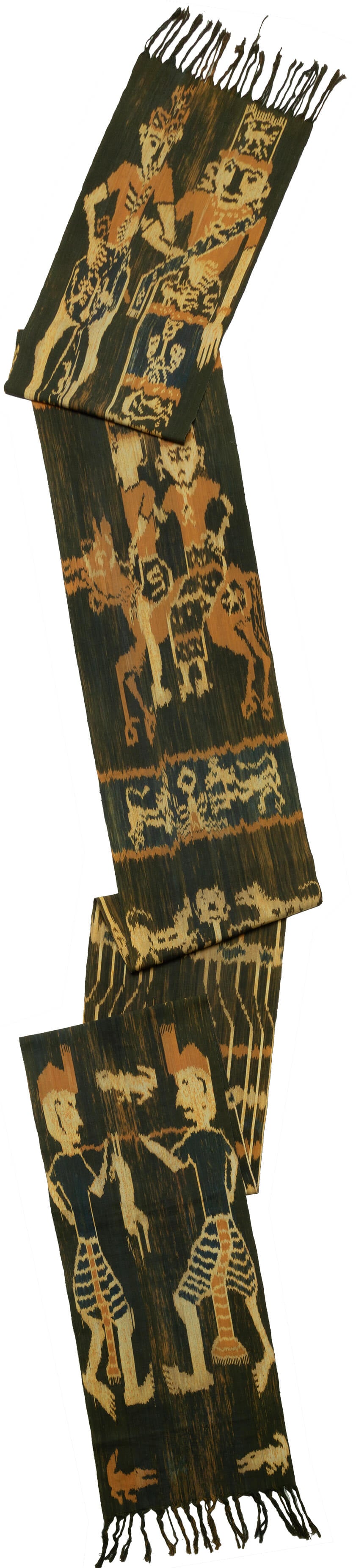 Ikat is a warp-resist dyeing technique similar to "tie-dyeing". It is a narrative textile that was likely intended for a wedding. It features various scenes of what appears to be a bride and groom arm in arm as well as on horseback and an animal being prepared for a feast. In a very large and unusual format with a palette of ivory, black, yellow, and blue.