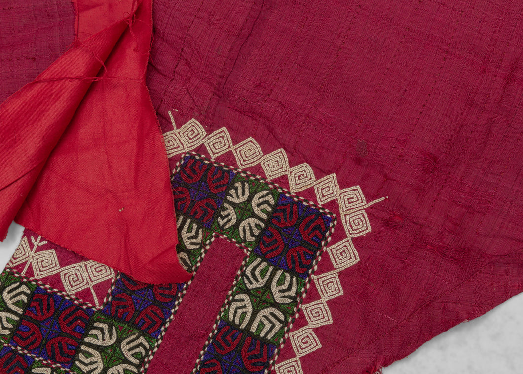Turkmen women traditionally wear colorful ankle-length dresses with baggy trousers in contrasting colors and decorated bands. These trousers feature wonderfully detailed embroidery bands near the ankles in blue, red, green, and ivory on a magenta cloth.