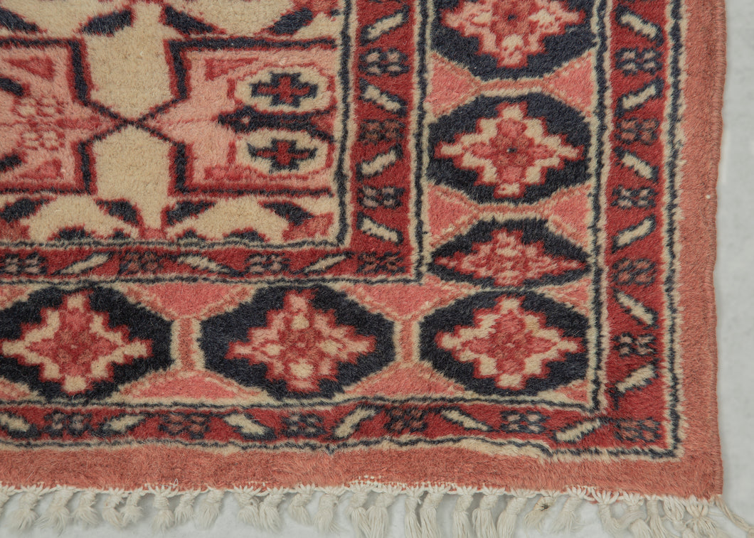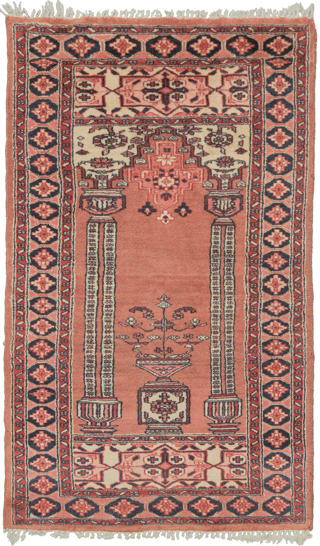 It features a flowering vase flanked by two pillars below a hanging lantern in soft pink, red, navy, and ivory. Woven in Pakistan by Afghan refugees in the 1980s, the pattern is a classic prayer design which is unusual for type as these often feature more traditional Turkmen-derived patterns.