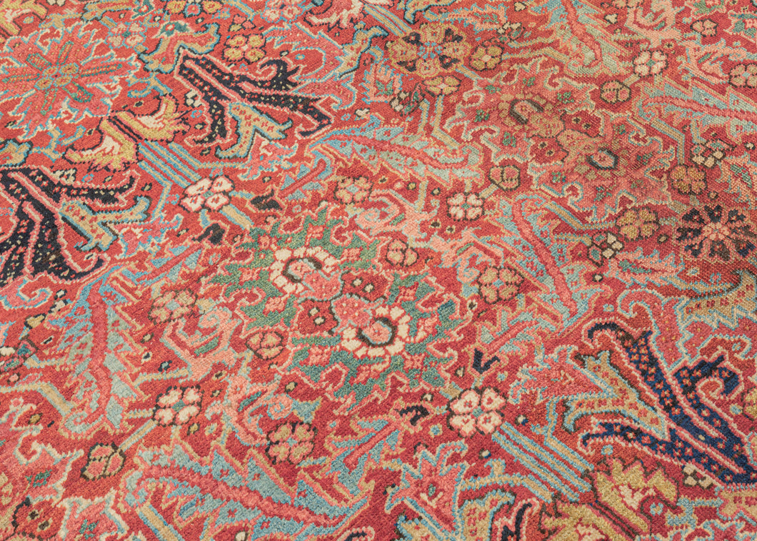 A richly patterned all-over Heriz with a dense field of stylized floral motifs arranged in horizontal bands, creating a continuous surface without a central medallion. Compared to more classical, sharply angular Heriz designs, the drawing here is softer and more whimsical, with rounded forms and a lively, almost textile-like flow.
