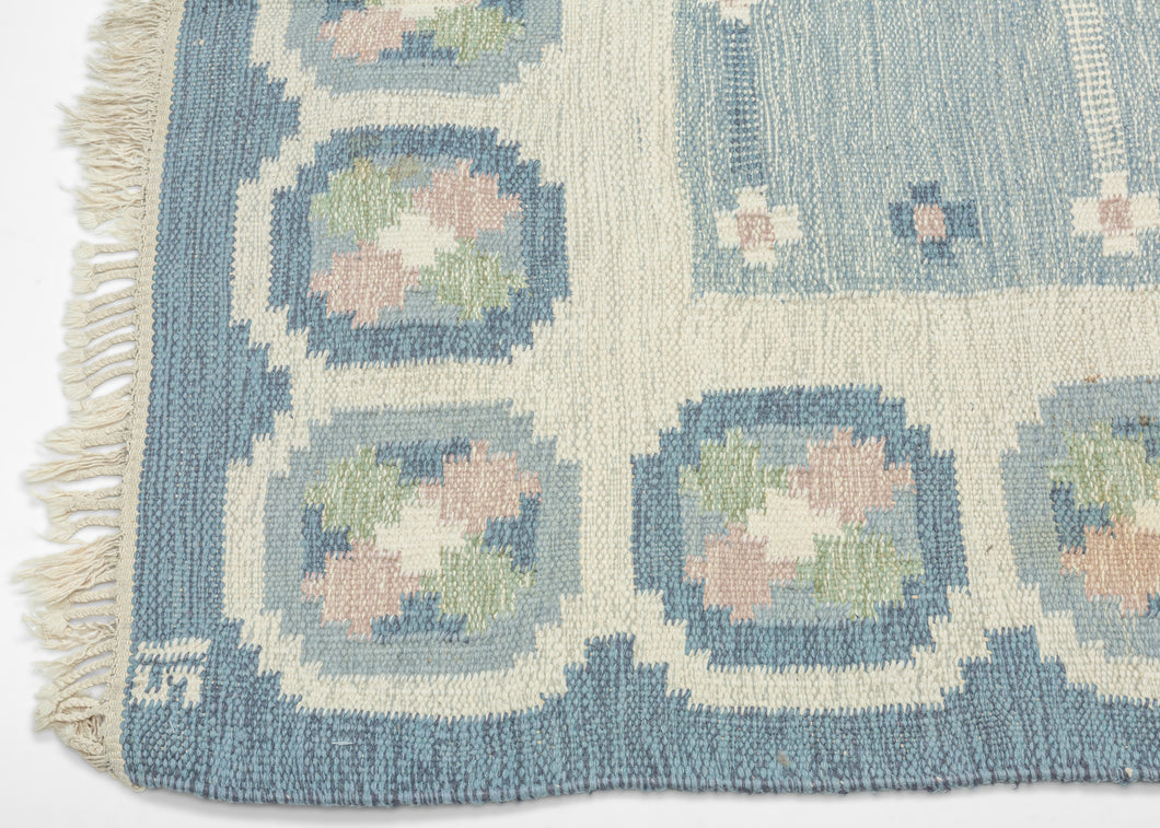 A refined mid-century Swedish flat weave by celebrated designer Ingegerd Silow, signed with her "IS" monogram in the lower right corner. Woven in soft glacier blues, cream, rose, and sage, this piece embodies the quiet elegance and warmth that define Scandinavian Modern textile design.