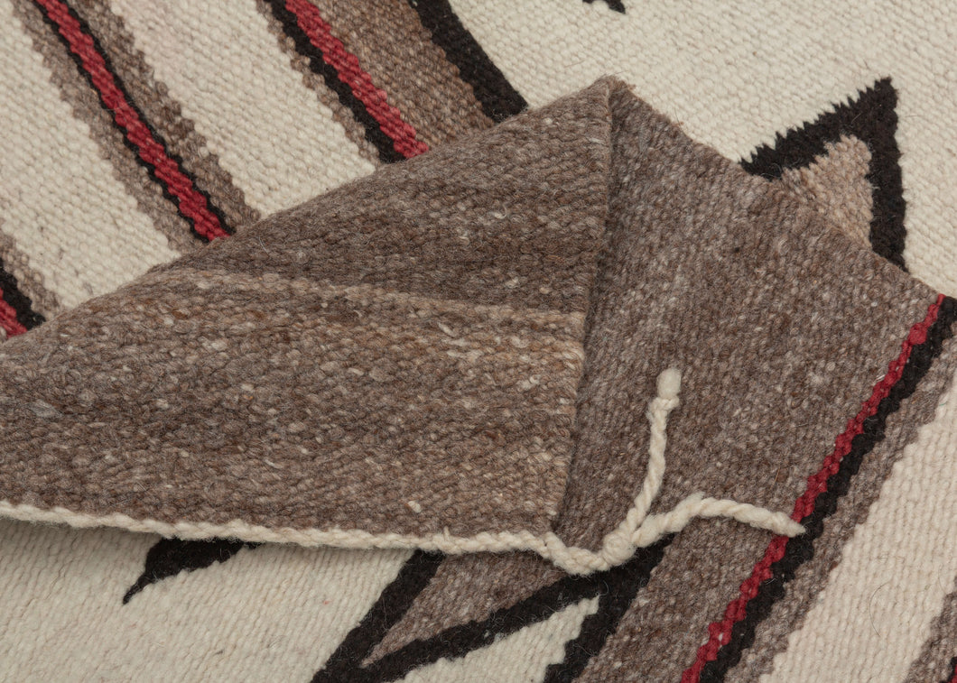 This piece reflects the refined geometry and graphic clarity that define Navajo textile artistry in the 20th century. The wool’s natural color variation creates gentle movement throughout the ground, giving the weaving both sculptural presence and a sense of quiet rhythm.