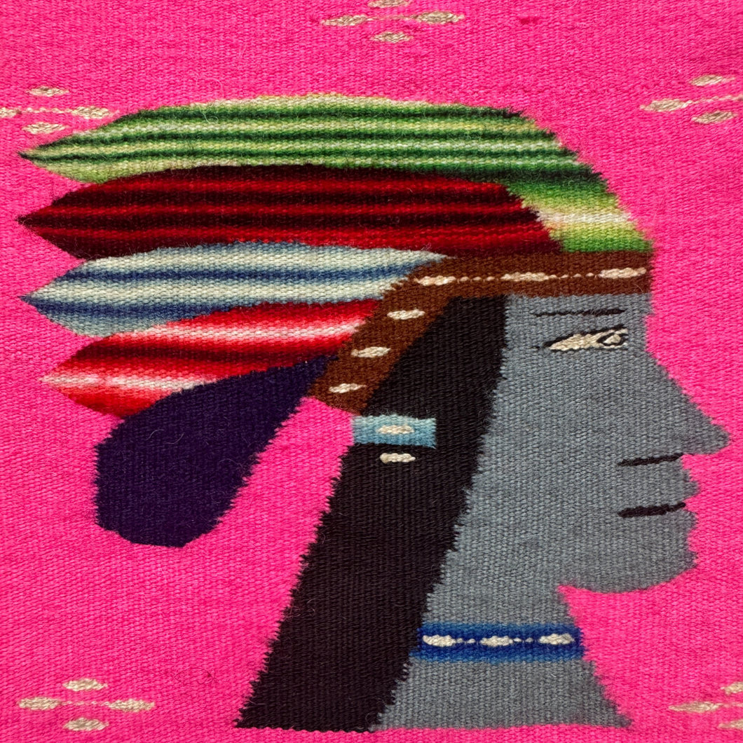 These small format pictorial weavings, sometimes called samplers or decorative mats, were produced in Zapotec villages such as Teotitlán del Valle during the mid-20th century. They often blended regional weaving traditions with motifs influenced by popular imagery and tourist demand. This striking profile composition shows the weaver’s technical skill and ability to capture expression within the tight geometry of tapestry weave.