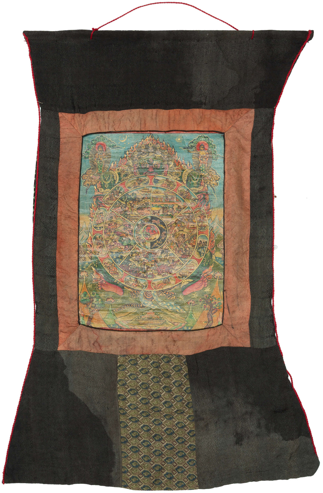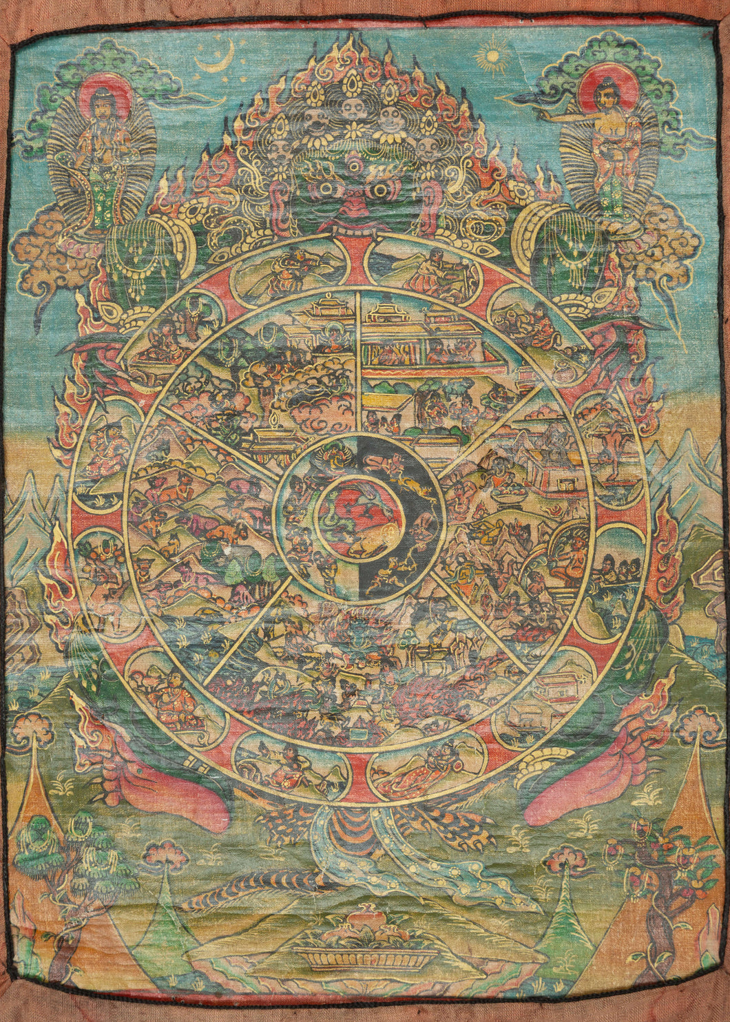 This intricate and vividly painted thangka illustrates the Bhavachakra or the Wheel of Life which a profound visual teaching on the Buddhist understanding of samsara, the endless cycle of birth, death, and rebirth. At the center, the three poisons of ignorance, attachment, and aversion are symbolized by the pig, rooster, and snake. Surrounding them are the six realms of existence, each finely rendered with remarkable narrative detail and expressive color.