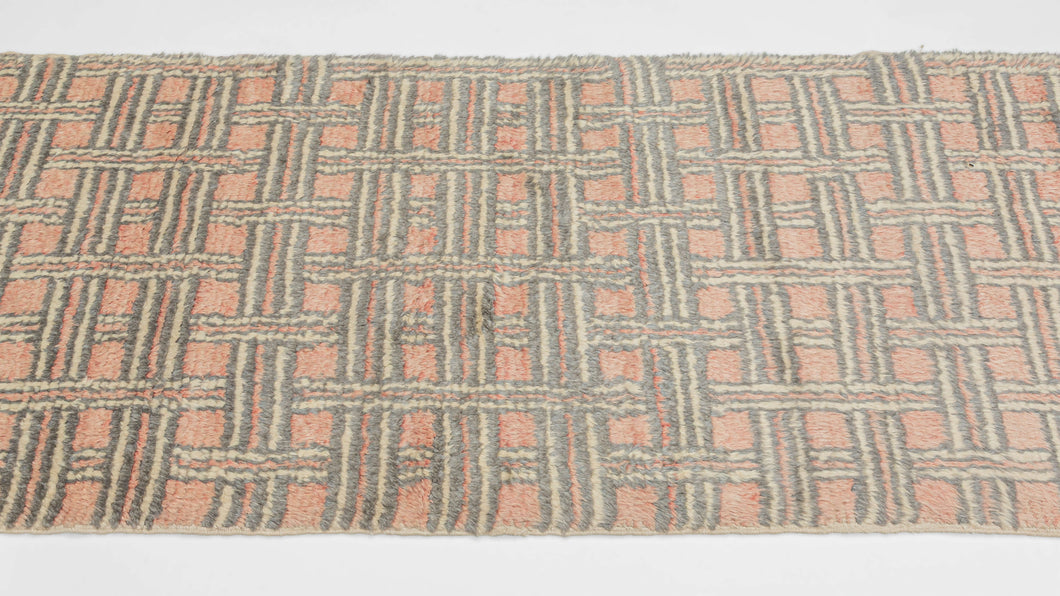 A finely woven Moroccan runner featuring a rhythmic lattice of interlocking bands that create a striking basket-weave effect across the field. Soft coral tones are set against alternating lines of cream and cool gray wool, giving the composition a subtle depth and gentle visual movement.